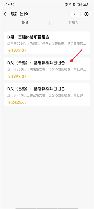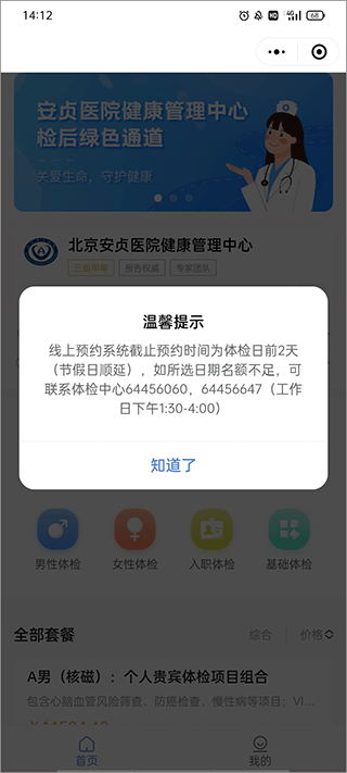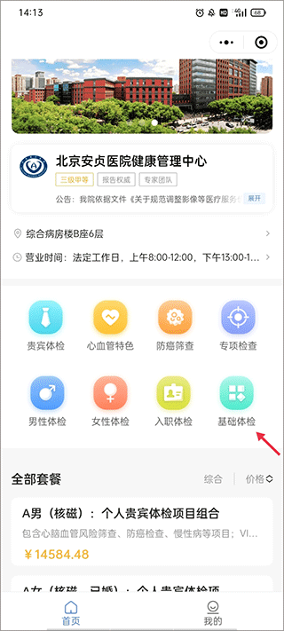 4、在管理中心首页的分类或展示的套餐中选择需要预约的体检套餐。