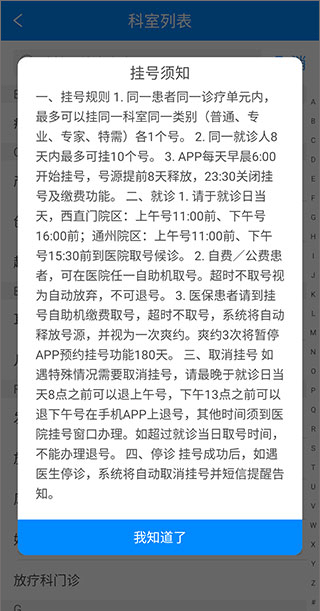 4、仔细阅读挂号须知后,点击最下方的【我知道了】按钮。