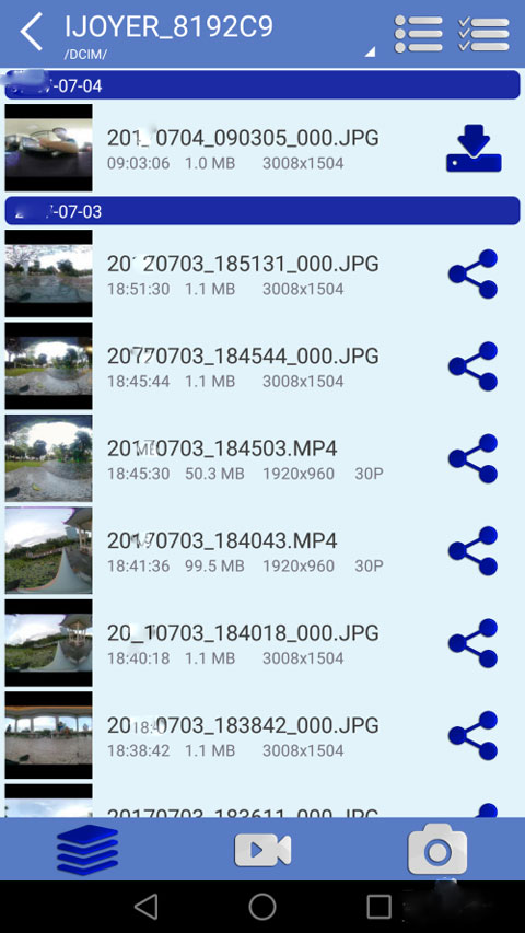 艾卓悦全景相机app的操作也非常的简单,用户只需要安卓手机的WiFi连接到相机设备手,就可以远程操控相机,如即时监控,下载档案、线上预览档案、线上播放、控制(录像或拍照)设定等各项功能,并且支持多种拍摄模式,能够满足用户的各种拍摄需求。并且,由于设备搭载了两颗佳能鱼眼镜头的360°全景相机,照片分辨率高达6112x3056,拍摄视频分辨率高达3840x1920,可以720度无死角拍摄到高清画面,可应用于旅游、极限运动、全景看房、航拍、VR教育、VR直播和全景内容制作等领域。