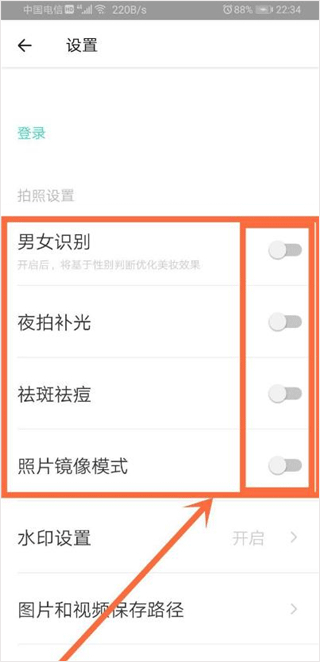 5、进入设置界面后,分别点击【男女识别、夜拍补光、祛斑祛痘和照片镜像模式】后面的【开启按钮】进入。