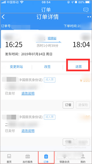 2、要退票的话,先在已支付订单里找到要退的那趟车次,然后点退票;