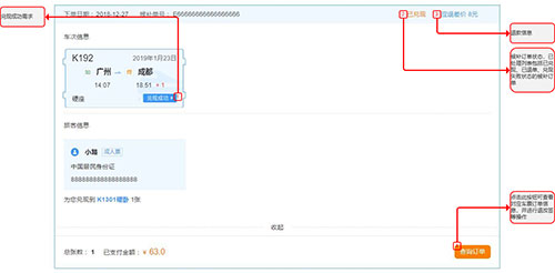 网站上在个人中心导航栏上点击“候补订单”可进入订单查看页,候补订单分为“待支付订单”、“待兑现订单”和“已处理订单”三个选项,其中“已处理订单”包含已兑现、已退单和兑现失败三种状态订单,已兑现表示候补需求兑现成功;已退单表示用户主动退单;兑现失败表示候补需求兑现失败,可能为车票数量不足、旅客行程冲突等原因。