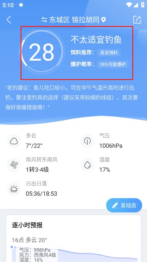2、可以看到这个钓鱼指数参数就是28,表明了在东城区锡拉胡同不适宜钓鱼,只有26%的可能爆护。