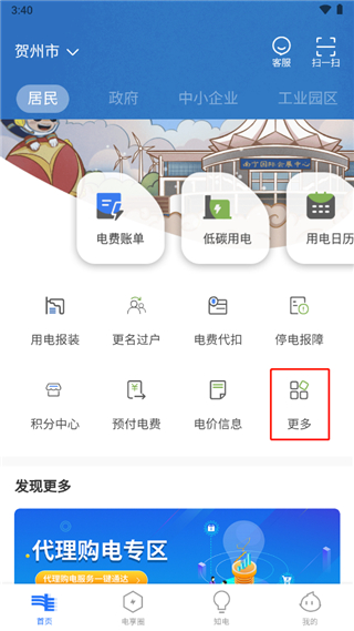1、进入软件首页,我们可以看到有预付电费、电费代扣、更名过户等功能,然后我们点击更多;