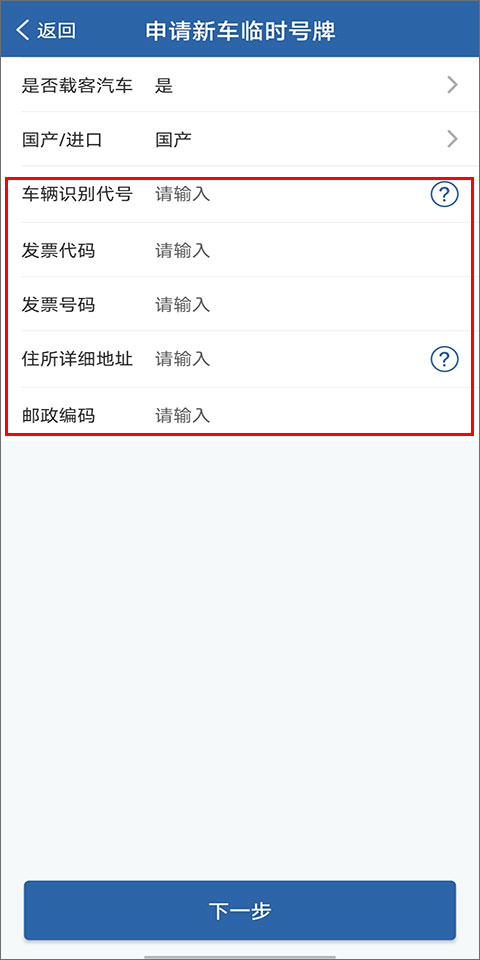 5、填写车辆识别代号、住址以及邮政编码等信息,如果不知道自己车辆的识别代号,可以点击后面的“?”了解如何查询,填写完成后点击“下一步”,并上传所需资料;