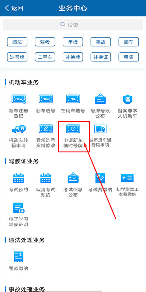 2、跳转到“业务中心”页面,在“机动车业务”下选择“申请新车临时号牌”点击进入;