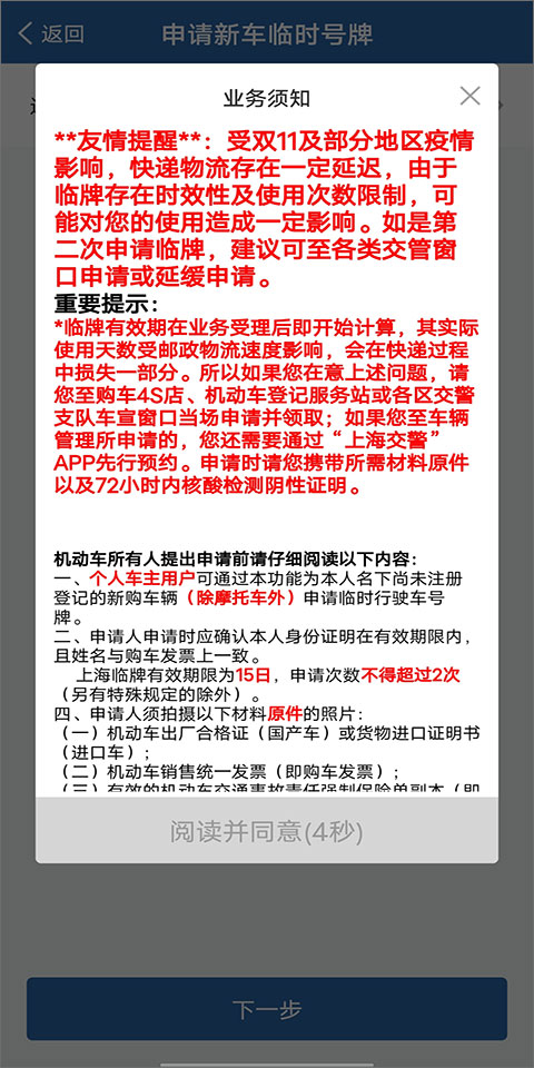 4、跳出“业务须知”后,阅读相应的文本并了解此项约定,然后在倒计时结束后,点击“阅读并同意”;