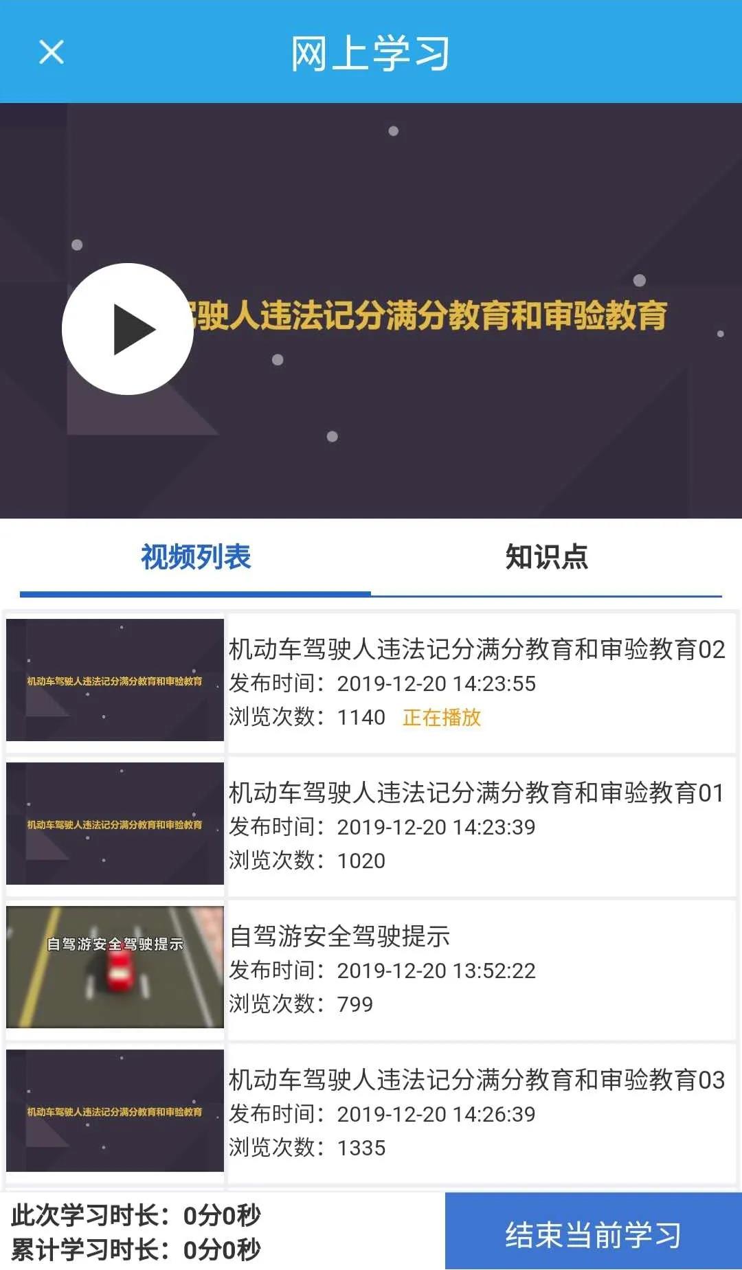 8、点击“知识点”,查看当前视频知识点,在查看当前页面时,开始计时。每次连续学习五分钟以上的计入累计学习时间,三日内累计学习满三十分钟为一次,学习时间达标后七个工作日内可以申请参加道路交通安全法律、法规和相关知识网上考试,考试未通过的可以在二十四小时内补考,补考以二次为限。