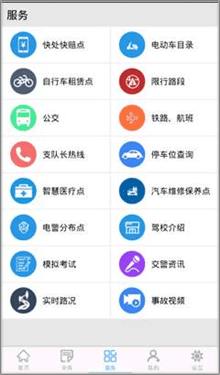 该板块包含快处快赔点查询、电动车目录、自行车租赁点、限行路段、支队长热线、停车位查询、智慧医疗点、汽车维修保养点、电警分布点、驾校介绍、模拟考试、交警资讯、实时路况、事故视频等功能。