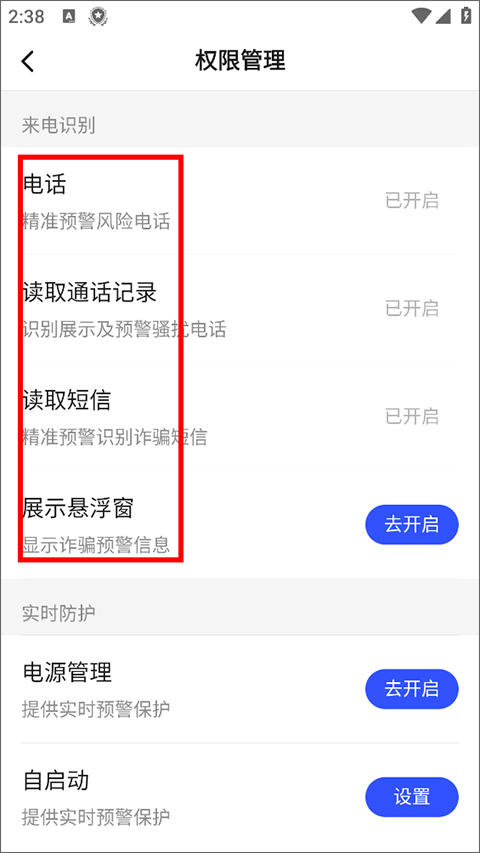 2、进入权限管理页面,用户需要开启电话、短信、通话记录、悬浮窗等权限;