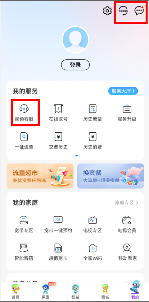 2、在我的页面中,用户可查看我的服务,我的家庭和特色业务功能板块,用户可在我的服务栏下点击视频客服,或者点击右上角的电话客服和消息按钮;