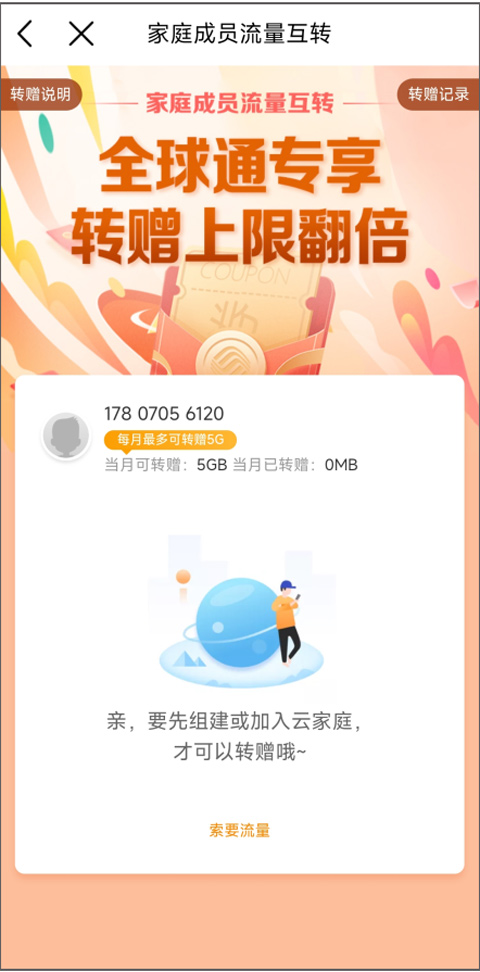 2、进入家庭成员流量互转页面,用户首先需要组建或加入云家庭才能转赠。