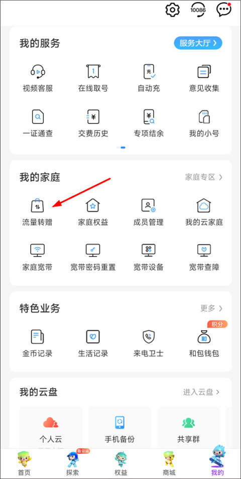 1、用户打开我的页面,在我的家庭功能栏下找到流量转赠并打开;