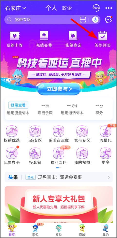 1、用户打开中国移动河北app,登录进入首页,点击首页右上角的签到领奖;