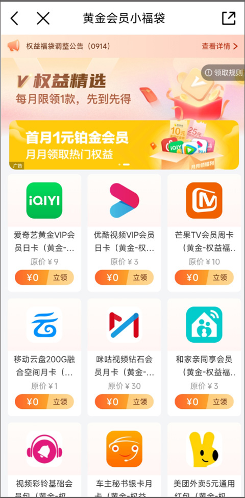4、点击免费福袋领取,进入黄金会员小福袋页面,用户可选择各大软件会员领取(每月仅限一款软件会员领取)。