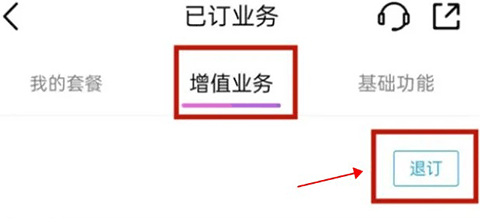 这个时候就查看我们订过的业务了,可以看见业务分为3大板块,分别是:我的套餐、增值业务,和基础功能、这个时候我们就点击增值业务就哭呀看见我们订购的流量套餐了,这个时候我们直接点击退订就可以了。