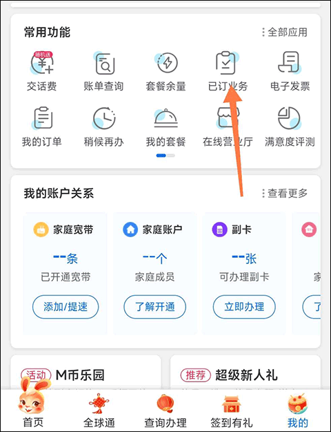 可以看见在常用功能那有许多对用户来说非常有用的功能,例如交话费、我的订单、账单查询、套餐余量等功能,这个时候我们点击其中的已订业务。