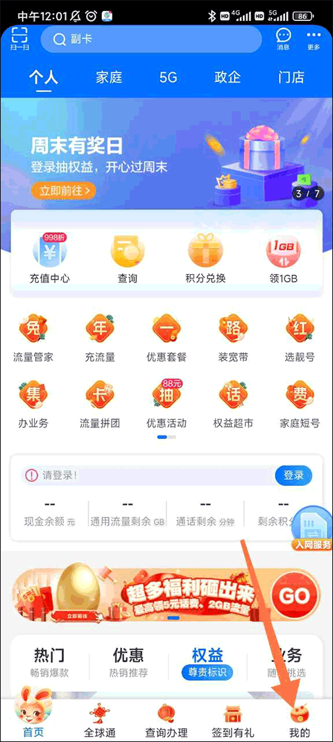 首先我们进入中国移动重庆app,进入之后能看见底部有5个进入其他界面的按钮,分别为首页、全球通、查询办理、签到有礼和我的,每个进入的界面也都不一样,现在我们点击我的进入个人界面。