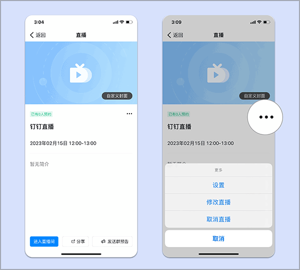 2、未开始的直播:点击未开始的直播可选择进入直播间/分享直播链接/发送群预告,也可点击右侧的【...】 自定义修改/取消直播