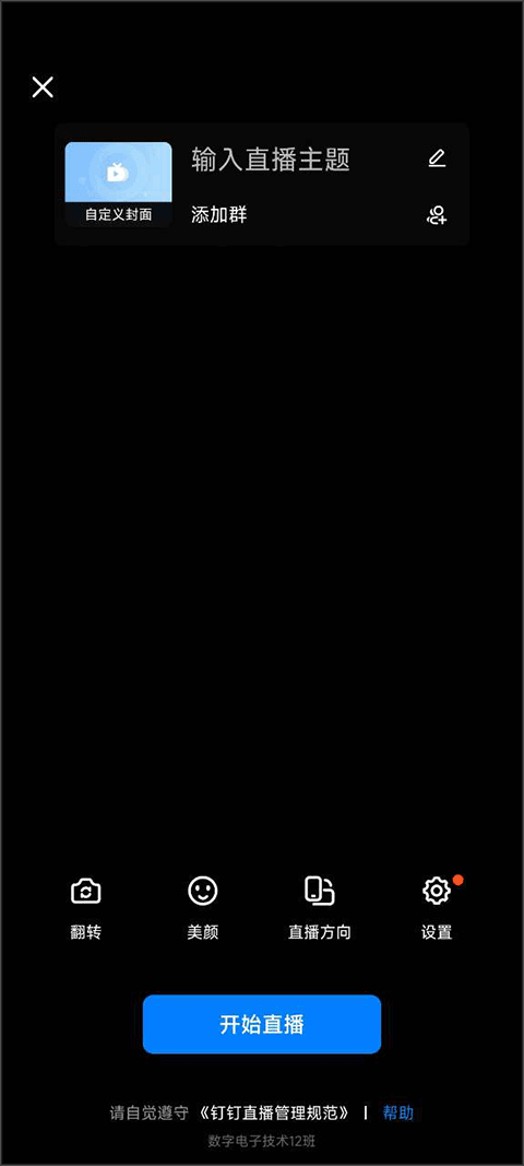 2、钉钉移动端群聊界面>>点击下方聊天框图标>>选择群直播>>自定义设置直播主题、直播封面、添加直播群等>>设置完成后点击下方开始直播即可