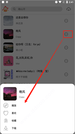 2、并点击歌曲旁边的按钮还可对其进行播放、喜欢、收藏、下载等操作