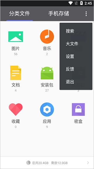 软件的功能挺多的,支持云备份、微信QQ文件分类、高速扫描智能分类、收藏和隐藏文件等等。支持的格式也很多,包括各种视频、压缩包、文档、音乐和图片格式,基本能满足大部分用户的需求了。使用方法也很简单,打开就能看到分类文件,还能搜索、复制、转发、删除或者加密文件。