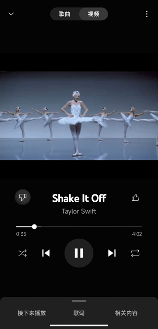 6、在歌曲的页面还可以观看本首歌的视频,并且下面还有一些其他选择,如:接下来播放、歌词、相关内容。