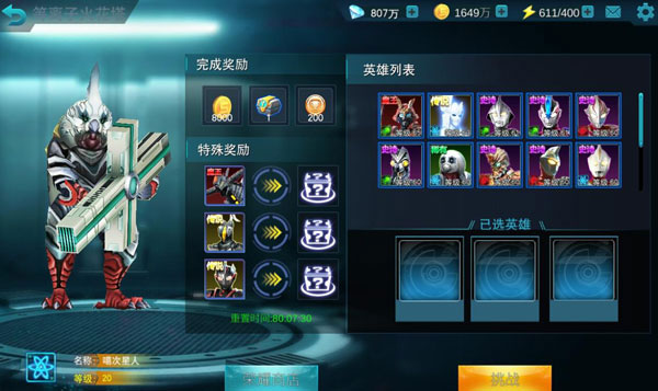 等离子火花塔第一关BOSS是噶次星人,该关奖励有200个荣耀勋章,这个BOSS难度并不高,值得注意的是,这个BOSS是远程职业,使用速度型英雄快速接近切入或者使用远程英雄对轰或是不错的选择!