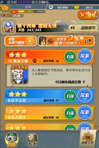 第二就是符咒的使用,三种符咒本来的功能上面写的很清楚,我就不说了,如何使用好呢,比如后期强度较高的第十八关,关卡分为四小关,那第一关基本不用符咒(当然要根据自己的战力来定,符咒掉落较少原则上省点用)如你回春符多点,没有招魂符的情况下,就要算好下轮可能损失的血量,分析是否进行补血了,因为弟子阵亡后回春符是不能用的。
