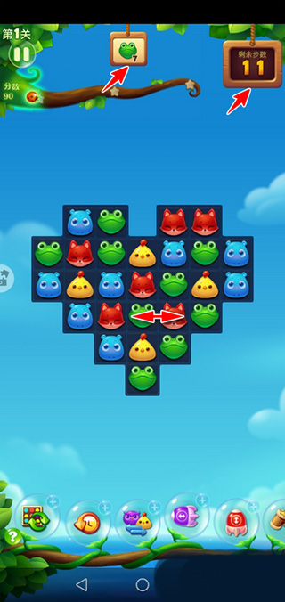 2、接下来,由于消除了 3 个青蛙,上方的任务牌就变成 7 了;同时由于用掉了 1 步,可用步数也变成 11 了。