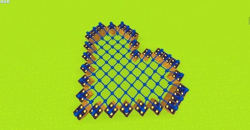 第二步,用蓝色电能线把所有的发射装置连接起来,心形中间也要用电能线连接起来,整个心形被电能线所覆盖
