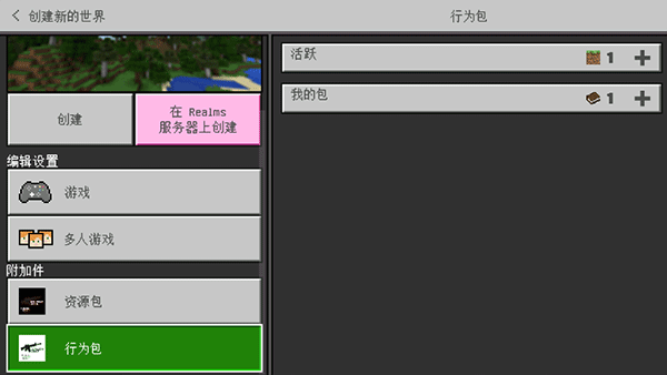 3、在左下角-附加件-点击“资源包”、“行为包”,在右边“我的包”点击模组图标-分别“激活”资源包与行为包