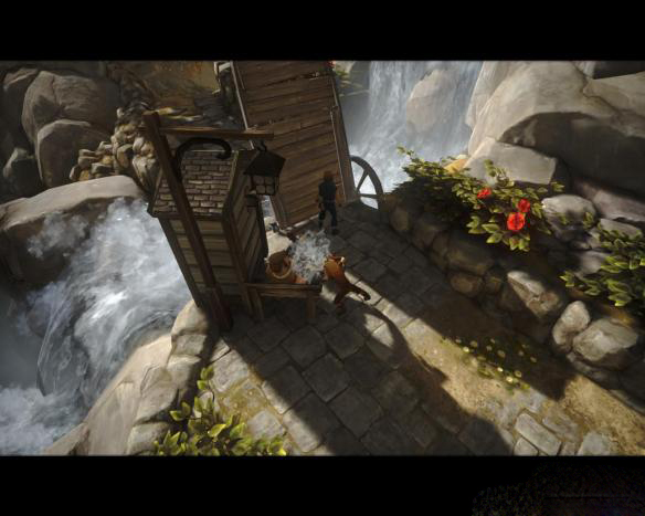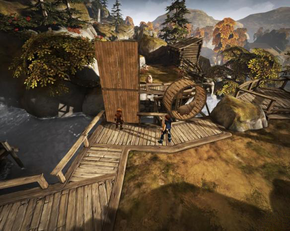 4、兄弟二人一路往下走,两人一起推开一扇门之后到达一个看起来像是存粮食的地方(路上有几口井,弟弟与井互动的话会往里面吐痰= =),会有一条狗不停朝兄弟二人狂叫,这时候需要兄弟二人切换互动,先由弟弟吸引狗的注意力之后,哥哥跑到“鼓”上,再由哥哥吸引狗的注意力,使弟弟能够通过,不断反复通过此处。之后往前走,通过障碍后来到一家农舍前,这时候需要通过一座小桥,先让弟弟在桥旁边的开关出不停跑步,哥哥去对岸抱一只羊回来,之后把羊扔上去,让羊来替弟弟跑,两人就可以通过了。
