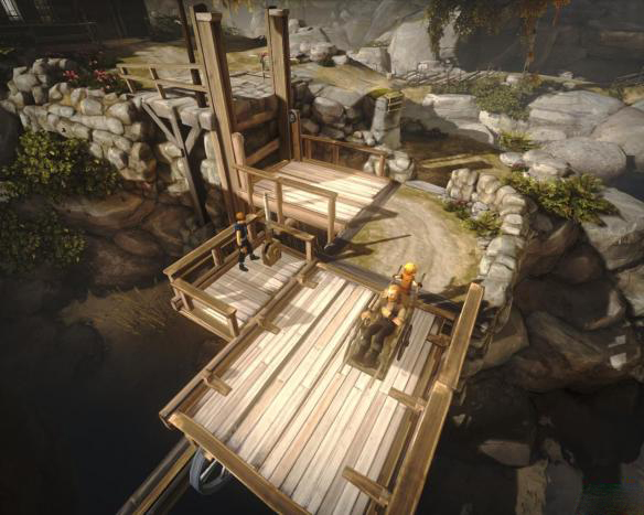 1、游戏开始后,沿着路往桥的方向走,会有一个简单的解谜,这里弟弟的力气不够,需要用哥哥来扳动把手,过桥往右边走,到一个断掉的梯子下,需要哥哥把弟弟抬上去,弟弟再去吧旁边的绳子放下,让哥哥上来,之后一起去扳动升降机边的把手。(两人一起)