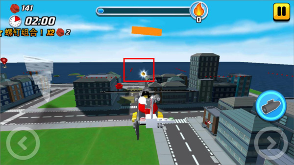 玩家进入空中消防关卡,需要控制直升机洒水,按照指示直走,路过一个龙卷风,龙卷风后面一个就是金砖,飞过龙卷风区域绕一圈就可以看到金砖,控制直升机飞往金砖上就可以直接获得,之后照常灭火就可以了。