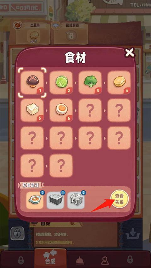 1、在合成界面,选择需要查看的食物或厨具,这里以【香菇】为例,点击【蓝色】小图标,