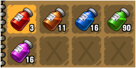 药剂则分为五种,标准药剂(蓝色)强壮药剂(红色)肥胖药剂(橙色)瘦小药剂(绿色)柔弱药剂(紫色)。药水用来提升人物体质。以下是每个人物需要的药水: