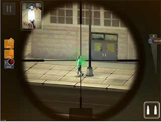 发现目标之后,拖动屏幕右侧的zoom条来放大屏幕,然后把狙击准心对准目标,点击右下角的弹夹。如果你找不到目标,可以点击屏幕左侧的“探测器”道具来标记他,误伤平民会直接导致任务失败,真是个悲伤的故事。