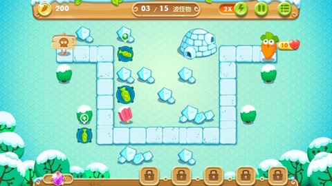 在关卡上会设置有雪地,丛林,冰河,天际,冰岛等几个主题,共有135个关卡,而且其模式应该还会与保卫萝卜一样。