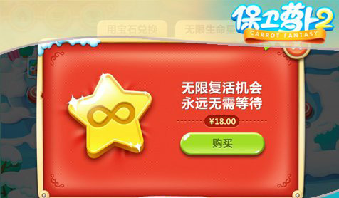 另一个一劳永逸的办法就是让游戏永远告别“生命星”。直接升级到无限生命状态,即便闯关失败也无需等待。游戏中有“无限生命星”可供选择,当然,这自然是需要你做出一点点的付出的。不愿花时间等待再次挑战的萝卜丝们,就可以自愿选择这个方法啦。