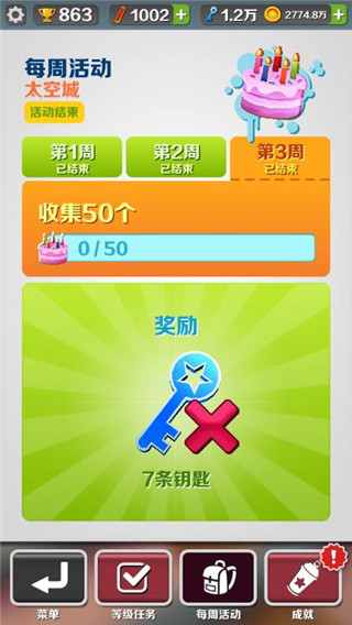 在游戏启动的时候,任务表显示在游戏主界面,在屏幕的左上方,在游戏进行当中也可以通过点击暂停按钮也可以进入任务列表,此时暂停按钮同样位于屏幕左上角。任务包括“收集500枚金币”“赢得1000分”诸如此类,任务达成之后将会在你完成当前一局游戏之后显示在主屏幕。