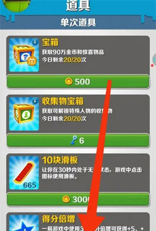 第二种方法:进入商店,点击道具,找到“得分倍增”,购买使召著用就可以在短时间内提升倍数。