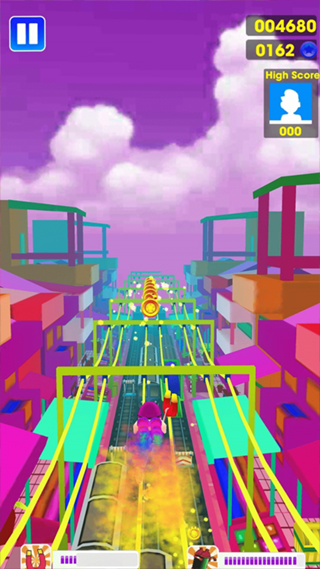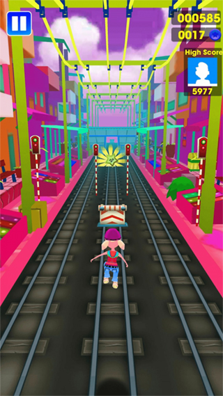 4、玩家快要跑到柱子的时候,会突然出现一辆列车。玩家这个时候往右边撞一下,然后快速回来,落下的位置正好在柱子前,这个时候发现我们的角色会不停的无限的跑,而我们的分数也在不停的涨。