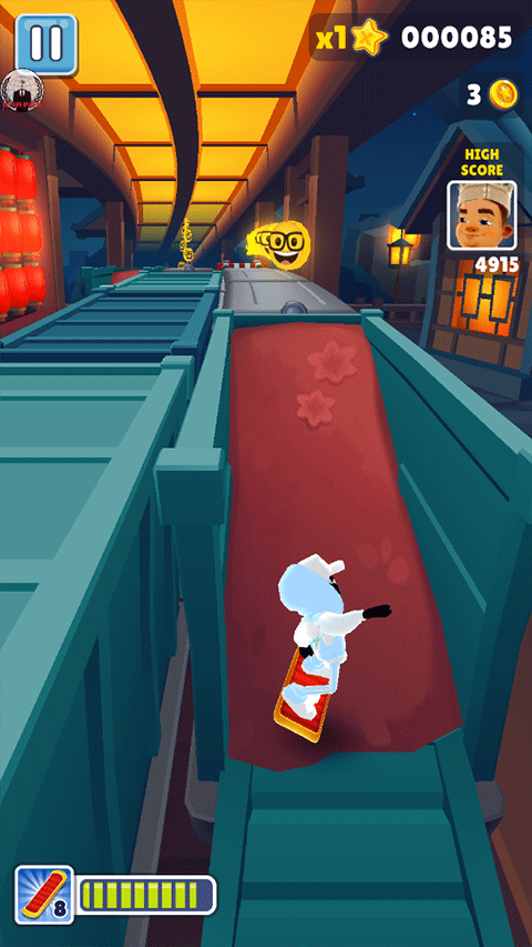 4、道具和装备:Subway Surfers提供各种各样的道具和装备,可以帮助玩家在游戏中取得优势。例如,喷漆罐可以用来绘制彩色的涂鸦,使得玩家在奔跑中能够收集更多的游戏币。还有磁铁可以吸引周围的道具,翅膀可以让玩家在空中滑翔等等。