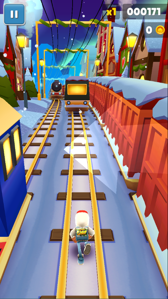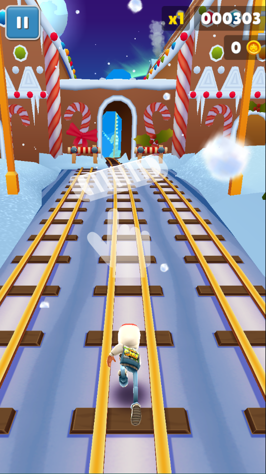 1、在地铁跑酷国际服圣诞节正版游戏中,当前方有障碍物时,向上或是下躲避