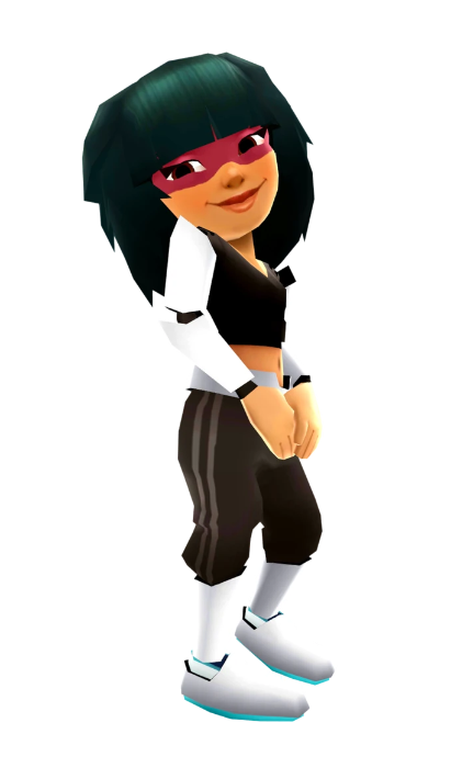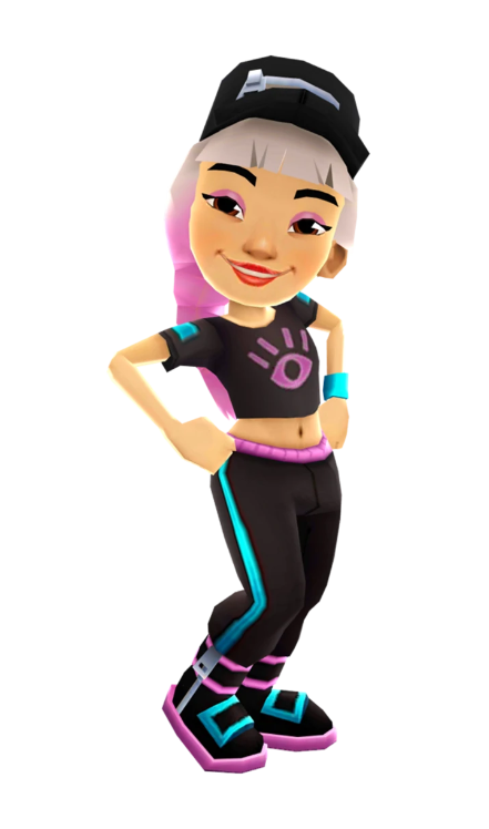 她把头发染成白粉色,梳成辫子和淡褐色的眼睛。至于服装,她戴着一顶拉链设计的黑色帽子,一件黑色背心,眼睛上有紫色的印花,露出她的腹部,黑色运动服带有粉红色和青色条纹和运动鞋。