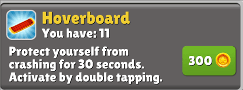 气垫滑板:双击屏幕可启动滑板道具,如果在没有启动滑板功能的情况下,角色撞上障碍物或者火车游戏就会结束,而在滑板状态下,等于给角色买了保险,滑板会在撞到障碍物时消失,但游戏可以继续进行。滑板在消失后的几秒内出现冷却时间,当闪烁结束后可通过双击再次启动,没有次数的限制。