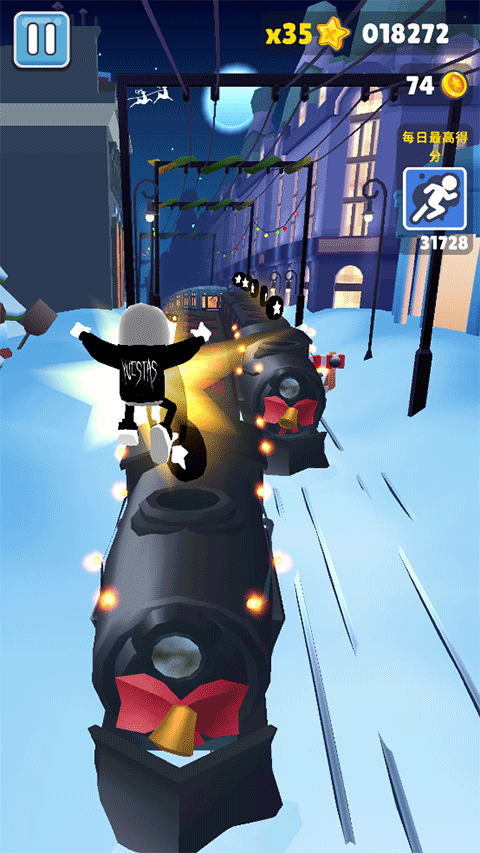 地铁跑酷Easft仿外网雪地版本是一款根据圣彼得堡地图改编而来的游戏,在这个版本中不仅以雪地为场景,还加入了丰富的圣诞元素,且金币也修改成了黑白色的星星币。而且玩家还能在游戏过程中直接感受到地图的变化,首先地图会转变为黄昏午夜,所以光线明暗交错的质感更强,在搭配白雪的反光,整体与现实中的圣诞节之夜非常接近,有一种寒冷中温暖四溢的感觉,非常具有特色。