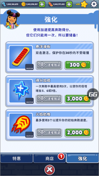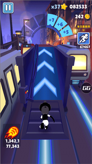 3、地铁跑酷很多道具都会对跳跃产生影响,比如跑鞋、助推器、跳跃道具等,特别是跳跃道具,可以跳到上方吃到很多金币,但是下落时,需要及时变更方向。