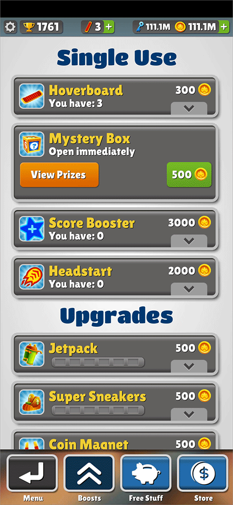 游戏里有好多道具,比如滑板、火箭助推、磁铁等等,这些都能帮助你更好地完成关卡。不过,这些道具也是隐藏的,需要用金币买,但金币同样隐藏着,所以你需要不断摸索才能找到它们。这种设计让我觉得有点难,但也挺有意思,因为每次玩都会有新的发现。